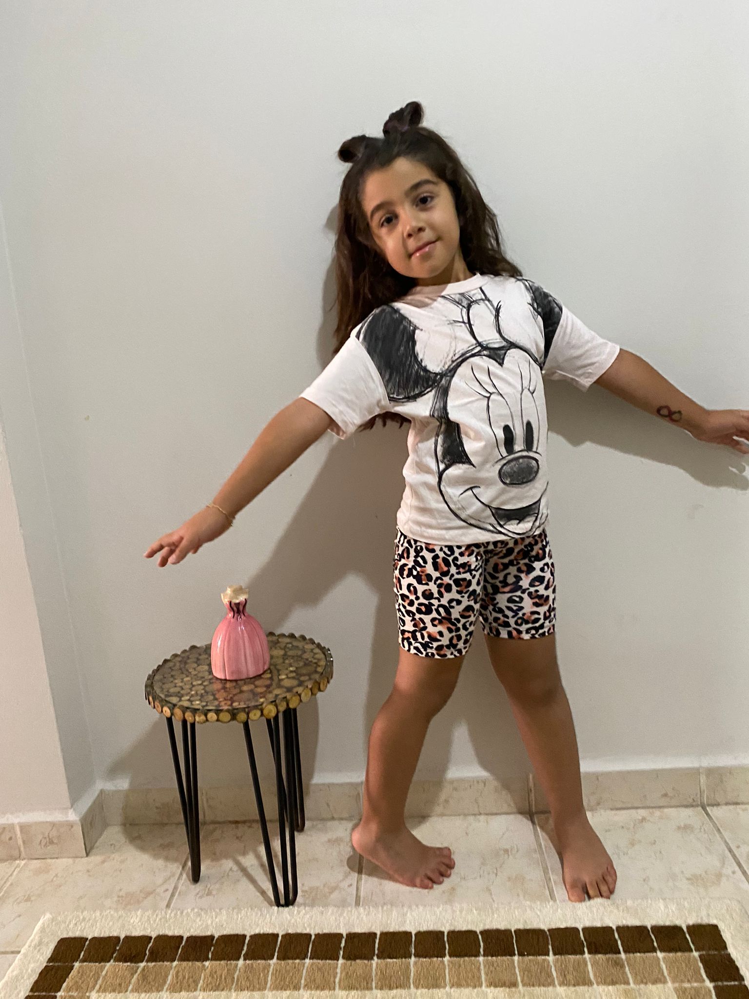 Takım içerisinde yer alan tişört, %100 pamuklu kumaşı sayesinde çocukların gün boyu rahat etmesini sağlar. Aynı zamanda, nefes alan yapısıyla terletmeyen bir özelliğe sahiptir. Beyaz renkli olması sayesinde de minimal ve sade bir görünüm sunar. Tişörtün ön tarafında yer alan Minnie Mouse figürü ise çocukların ilgisini çekecek kadar detaylı ve sevimlidir.